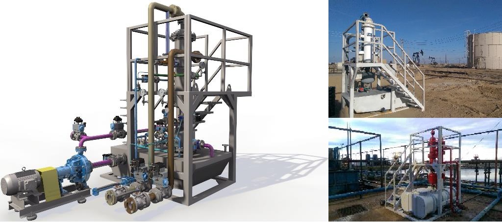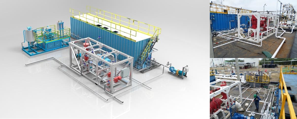 Equipos: Centrifugas decantadoras, centrifuga separadora de discos, evaporador Flash, Caldera, unidad de preparación e inyección de polímero, tanques de proceso y bombas Centrifugas, neumáticas y de piñones. Desarrollo de Especificaciones, Diseño, Manufactura, Instalación, pruebas, Operación, Mantenimiento